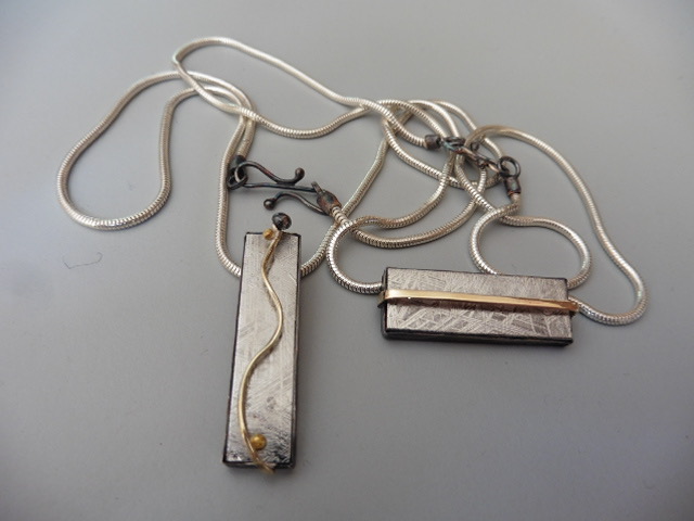 Pendant commission 2018.  Meteorite slice set in silver with gold bar on silver snake chain.